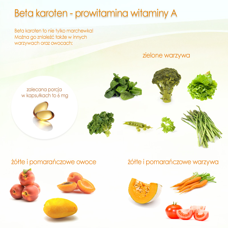 Co chroni nas przed niebezpieczeństwem poparzenia czy bardziej groźnymi, odległymi skutkami nadmiaru promieni UV? Znakomitą ochroną przed słońcem są karoteny, w tym beta-karoten, prekursor witaminy A. Dieta bogata w ten składnik powoduje odkładanie się go w skórze, co sprawia, że jest ona czasowo bardziej odporna na działanie szkodliwych promieni. Ponadto nadaje on skórze ładniejszy koloryt. Witamina A powstająca z niego jest silnym przeciwutleniaczem (chroni przed szkodliwymi wolnymi rodnikami) oraz jest niezbędna do prawidłowej kondycji skóry, włosów i paznokci.
