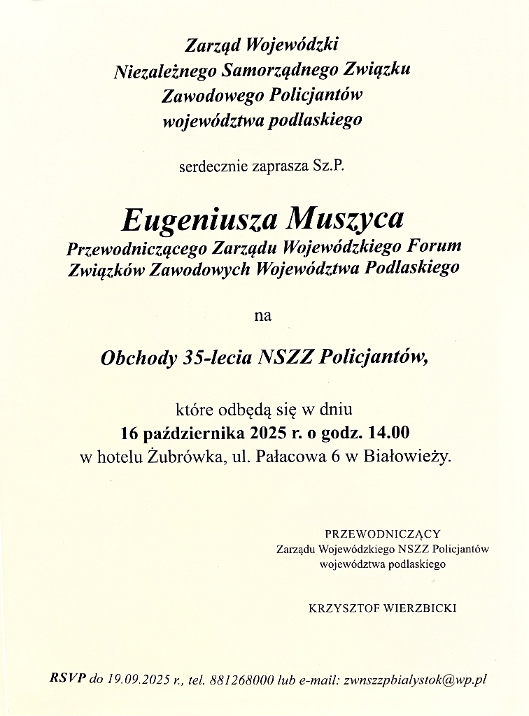 Dnia 16 października 2025 r. w hotelu “Żubrówka” w Białowieży odbyły się obchody 35-lecia Niezależnego Samorządnego Związku Zawodowego Policjantów. Obchody odbyły się hucznie i z wielką klasą, za co serdeczne podziękowania składamy przewodniczącemu, Krzysztofowi Wierzbickiemu. Za owocną i długotrwałą współpracę, Krzyżem 35-lecia NSZZ Policjantów odznaczony został Eugeniusz Muszyc, przewodniczący FZZ na Podlasiu. Uroczystość uświetniała doskonała muzyka.