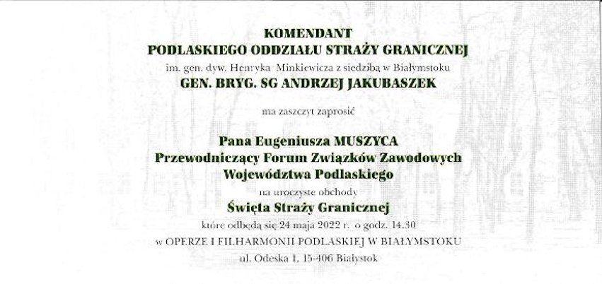 24 maja 2022 r. w Operze i Filharmonii Podlaskiej odbył się uroczysty apel z okazji 31 rocznicy powołania Oddziału Straży Granicznej. W uroczystości wzięli udział funkcjonariusze podlaskiej Straży Granicznej, policji, Wojska Polskiego, Lasów Państwowych, WITD, duchowieństwa, a także wojewoda podlaski i przedstawiciele podlaskich władz samorządowych. Z ramienia związków zawodowych na obchody zaproszony został przewodniczący Forum Związków Zawodowych Woj. Podlaskiego, Eugeniusz Muszyc.