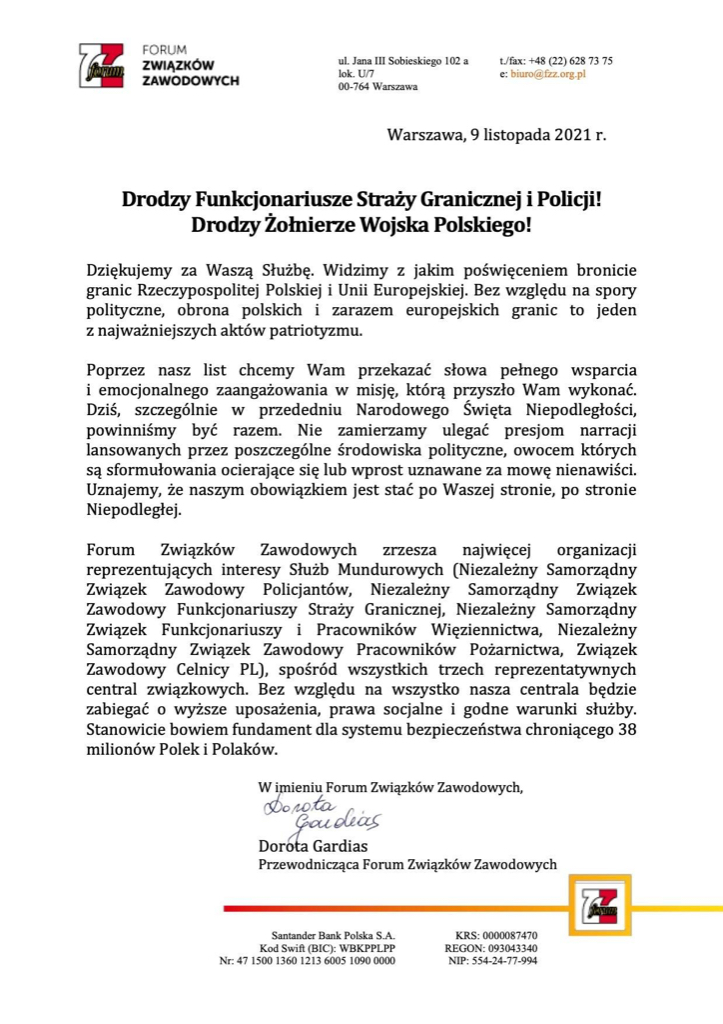 W bieżcym roku, w sposób szczególny, w obchody listopadowego święta wpisuje się służba unkcjonariuszy wojska, policji i straży granicznej na granicy polsko-białoruskiej. Dlatego pozwalamy sobie przytoczyć składane na ich ręce podziękowania wystosowane przez Przewodniczącą Forum Związków Zawodowych, Dorotę Gardias.