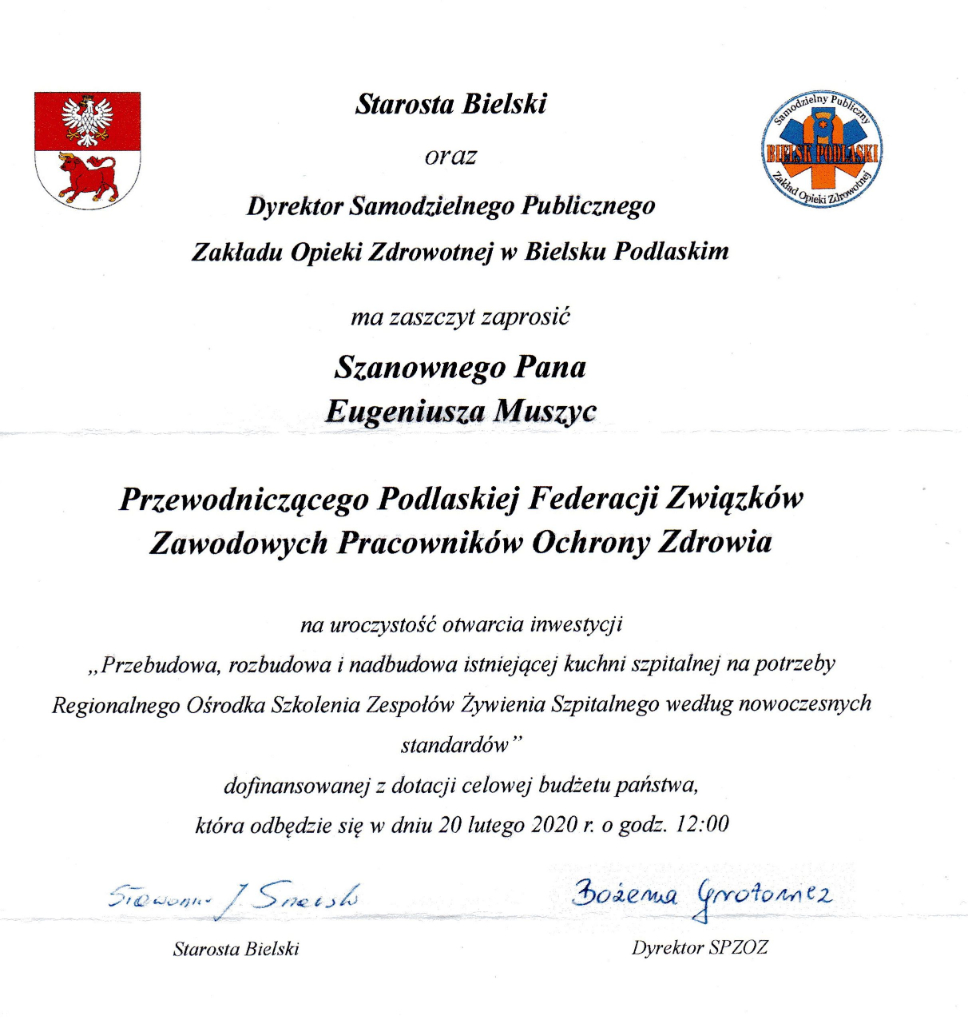20 lutego 2020 r. miało miejsce uroczyste otwarcie Regionalnego Ośrodka Szkolenia Zespołów Żywienia Szpitalnego przy SPZOZ w Bielsku Podlaskim. Dawny budynek kuchni szpitalnej, zbudowany w latach 60-tych, przeszedł gruntowny remont dzięki realizacji projektu pn. „Przebudowa, rozbudowa i nadbudowa istniejącej kuchni szpitalnej na potrzeby Regionalnego Ośrodka Szkolenia Zespołów Żywienia Szpitalnego według nowoczesnych standardów”. Na uroczystość przybyło wielu zaproszonych gości: politycy, samorządowcy, związkowcy, dyrektorzy szpitali i innych instytucji, duchowni. Podczas uroczystości pokazano prezentacje multimedialne opisujące zakres zrealizowanego projektu. Starosta bielski uhonorował Dyrektora SPZOZ Bożenę Grotowicz oraz Zastępcę Dyrektora ds. lecznictwa Arsalana Azzaddina odznakami „Za zasługi dla ochrony zdrowia” przyznanymi przez Ministra Zdrowia. Spotkanie umilił występ artystyczny przedszkolaków. Po uroczystym przecięciu wstęgi, na zakończenie części oficjalnej, zaproszeni goście udali się na zwiedzanie nowej kuchni i sąsiednich pomieszczeń.