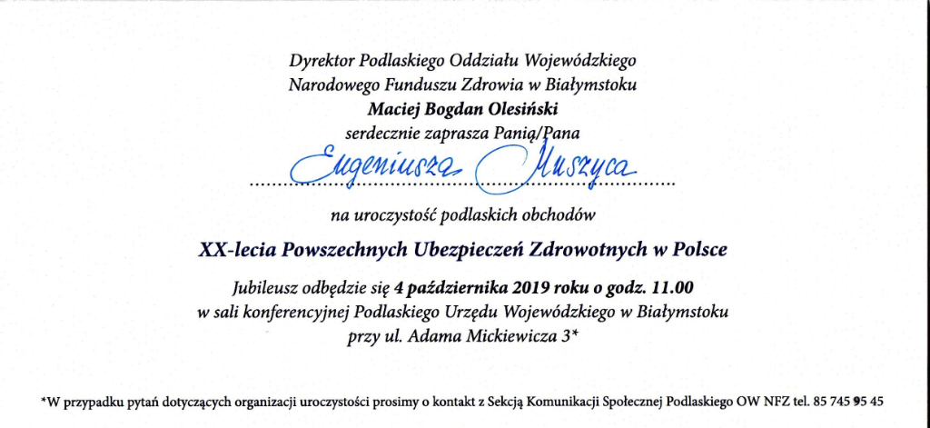 4.10.2019r. Podlaski Oddział Wojewódzkiego Narodowego Funduszu Zdrowia świętował 20-lecie powszechnych ubezpieczeń zdrowotnych w Polsce. W uroczystości, która odbyła się w Podlaskim Urzędzie Wojewódzkim, oprócz pracowników Podlaskiego Oddziału Wojewódzkiego NFZ wzięli udział zaproszeni goście: przedstawiciele rządu, władze województwa, samorządowcy, dyrektorzy szpitali, związkowcy. Podsumowano dotychczasowe funkcjonowanie systemu i dyskutowano o tym, jak powinien wyglądać w przyszłości. Reforma służby zdrowia dała początek Kasom Chorych w 1999r. W 2003 roku zastąpił je Narodowy Fundusz Zdrowia, a z roku na rok budżet, którym dysponuje jest coraz większy. Pracownicy Podlaskiego Oddziału NFZ z najdłuższym stażem, jak też osoby zasłużone dla systemu zostali uhonorowani odznaką jubileuszową przyznaną przez Prezesa Narodowego Funduszu Zdrowia.