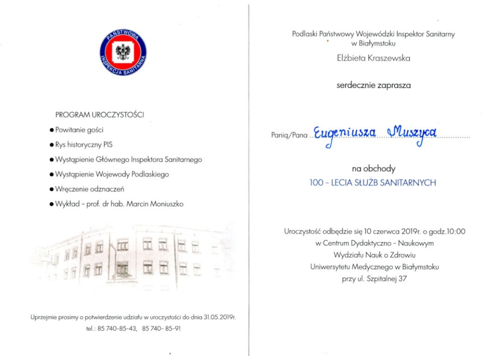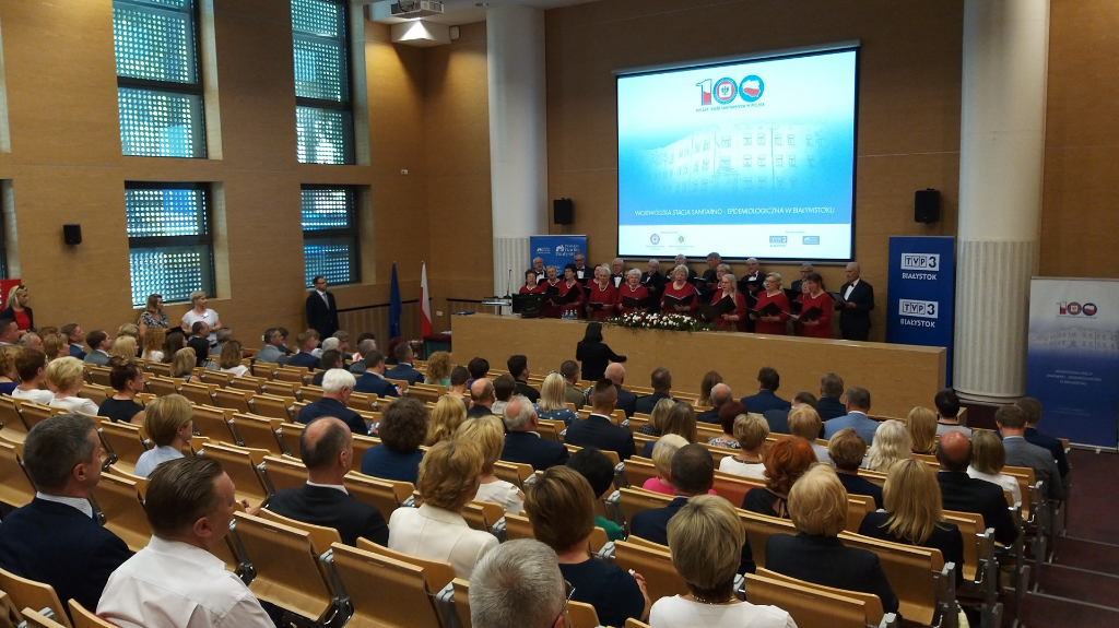 10 czerwca 2019r. w Centrum Dydaktyczno-Naukowym Wydziału Nauk o Zdrowiu UMB odbyły się uroczystości jubileuszowe związane z setną rocznicą Służb Sanitarnych w Polsce. Służby sanitarne czuwają nad bezpieczeństwem zdrowotnym wszystkich mieszkańców, zarówno w miejscu nauki, w środowisku pracy, w dystrybucji żywności, w punktach handlowych. Zajmują się też szeroko rozumianą promocją zdrowia. W naszym regionie w służbach sanitarnych pracuje ok. 250 osób. W skład Państwowej Inspekcji Sanitarnej w naszym regionie wchodzi: Wojewódzka Stacja Sanitarno-Epidemiologiczna w Białymstoku i 15 placówek terenowych. Poniedziałkowa gala była okazją do zaprezentowania historii Służb Sanitarnych w Polsce oraz zakresu ich działalności. Najbardziej zasłużonym pracownikom Państwowej Inspekcji Sanitarnej Województwa Podlaskiego odznaczenia wręczyli Główny Inspektor Sanitarny i Wojewoda Podlaski Bohdan Paszkowski. W gali wzięli udział m.in. politycy, samorządowcy, związkowcy, duchowieństwo, reprezentanci świata nauki.