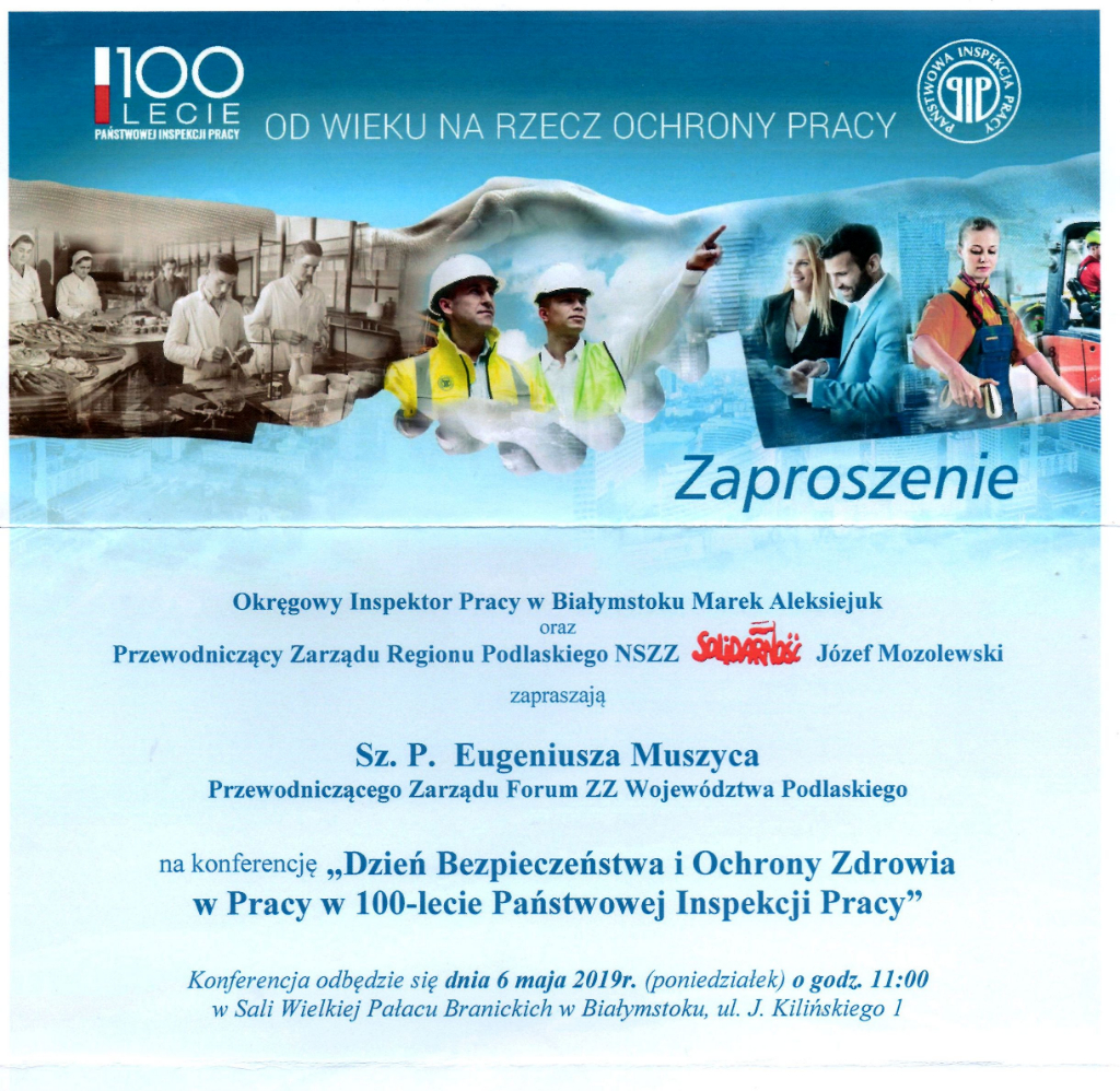 6 maja 2019r w Aula Magna Pałacu Branickich w Białymstoku odbyła się uroczysta konferencja “Dzień Bezpieczeństwa i Ochrony Zdrowia w Pracy w 100-lecie Państwowej Inspekcji Pracy”. Organizatorami konferencji byli: Okręgowy Inspektorat Pracy w Białymstoku oraz Region Podlaski NSZZ „Solidarność”. Wśród uczestników konferencji i zaproszonych gości byli m.in. przedstawiciele samorządu i administracji rządowej, Wojewódzkiej Stacji Sanitarno–Epidemiologicznej, Urzędu Dozoru Technicznego, powiatowych i wojewódzkich urzędów pracy oraz przedstawiciele organizacji pracodawców i związków zawodowych, a także społeczni inspektorzy pracy. Z okazji stulecia utworzenia Państwowej Inspekcji Pracy, odznaczono medalami wieloletnich pracowników Okręgowego Inspektoratu Pracy w Białymstoku. Zebranym gościom zaprezentowano film dokumentalny nt. 100-lecia PIP oraz szereg prezentacji multimedialnych przybliżających historię, zadania, działalność i osiągnięcia Państwowej Inspekcji Pracy na przestrzeni lat.