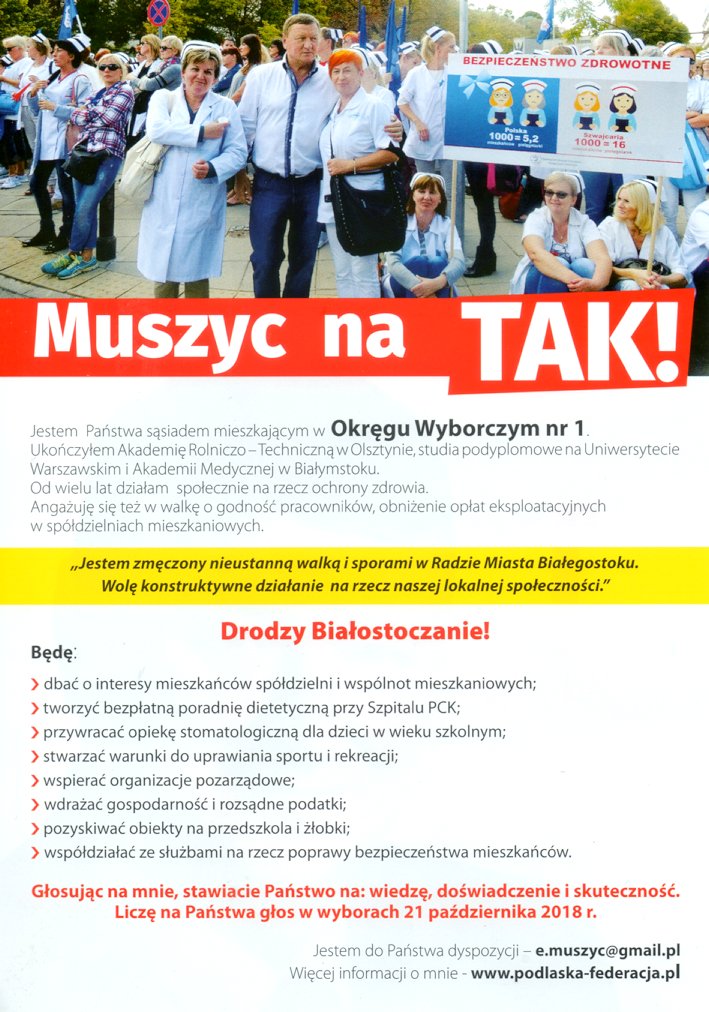 Jestem zmęczony nieustanną walką i sporami w Radzie Miasta Białegostoku. Wolę konstruktywne działanie, dlatego zdecydowałem się kandydować w nadchodzących wyborach samorządowych z Okręgu Wyborczego nr 1 (osiedla: Piaski, Przydworcowe, Bema, Kawaleryjskie, Nowe Miasto). Od wielu lat, razem z Wami, działam społecznie na rzecz ochrony zdrowia, angażuję się w walkę o godność pracowników. Mam nadzieję, że jako radny, będę mógł osiągnąć jeszcze więcej, zyskam dodatkowe możliwości. Kandyduję, bo chciałbym, żeby zmieniły się polskie zwyczaje podstawiania nogi każdemu, kto chce zrobić coś dobrego. Bo chciałbym, aby ludzie zaczęli głosować ZA, a nie PRZECIWKO. Startuję z komitetu wyborczego Tadeusza Arłukowicza – Białystok na TAK, bo uważam, że to kompetentny, rzeczowy, uczciwy kandydat na Prezydenta Miasta Białegostoku. W swojej kampanii nie mam zamiaru nikogo atakować, ani posługiwać się różnego rodzaju nieczystymi chwytami. Nie chcę walczyć przeciwko moim kontrkandydatom. Mam przyjaciół, kolegów, znajomych z różnych stron sceny politycznej, których cenię za charyzmę oraz skuteczną działalność i to się nie zmieni. Niech wygrają najlepsi.