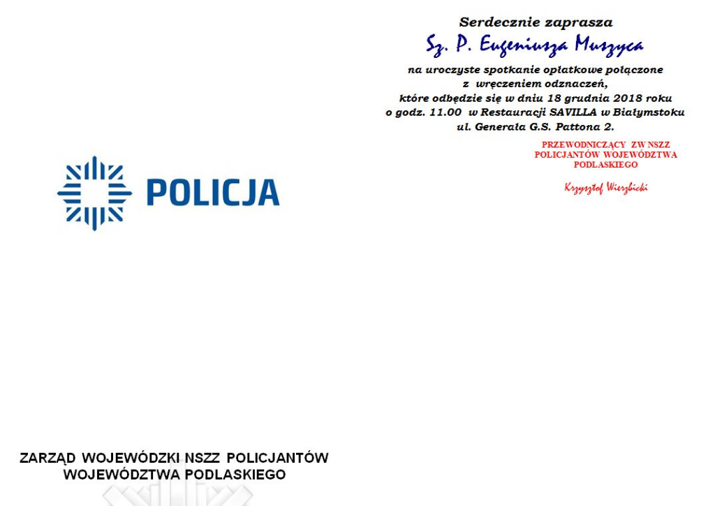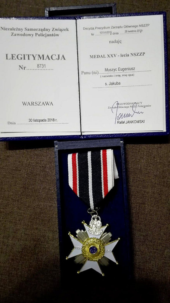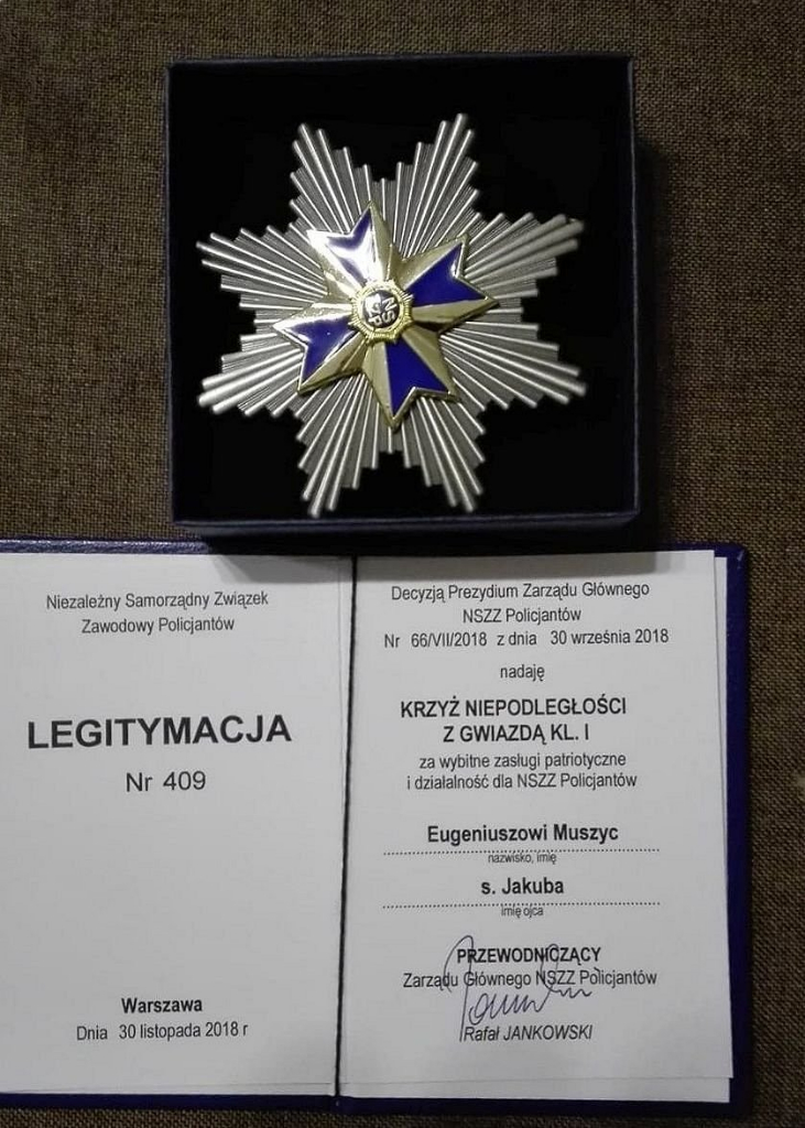 18 grudnia 2018r. odbyło się spotkanie opłatkowe zorganizowane przez Niezależny Samorządny Związek Zawodowy Policjantów Województwa Podlaskiego. Ciepłe, świąteczne spotkanie, pełne życzeń i planów na przyszłość, połączone było z wręczeniem odznaczeń osobom współpracującym z NSZZP, działaczom związkowym, aktywistom. Decyzją Prezydium Zarządu Głównego NSZZP, za wybitne zasługi i wieloletnią współpracę, Eugeniusz Muszyc został odznaczony Krzyżem Niepodległości z Gwiazdą Kl.I oraz Medalem XXV-lecia NSZZP. Składamy serdeczne gratulacje wszystkim odznaczonym, życząc jednocześnie energii i zapału do dalszej działalności i współpracy na Nowy 2019 Rok, a także na wszystkie kolejne lata.