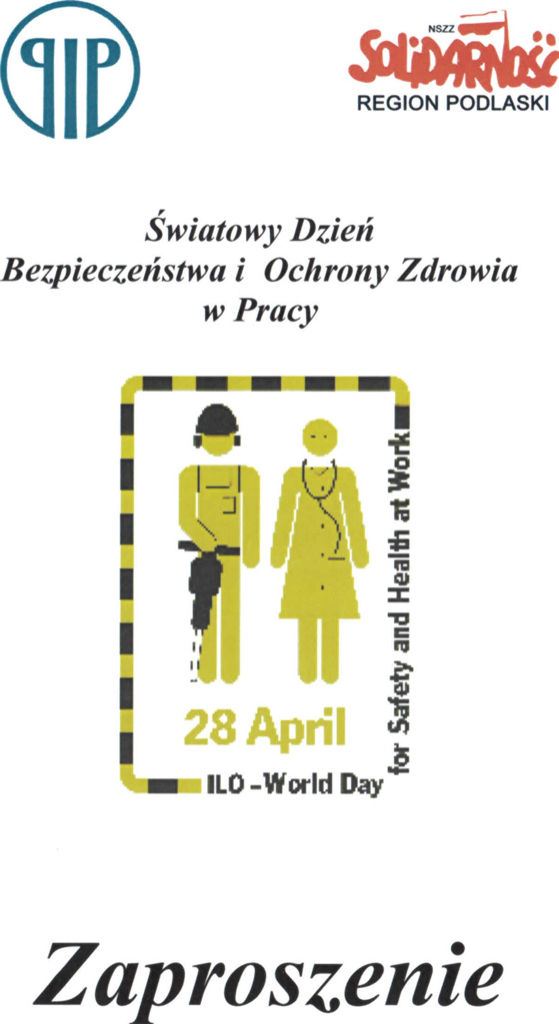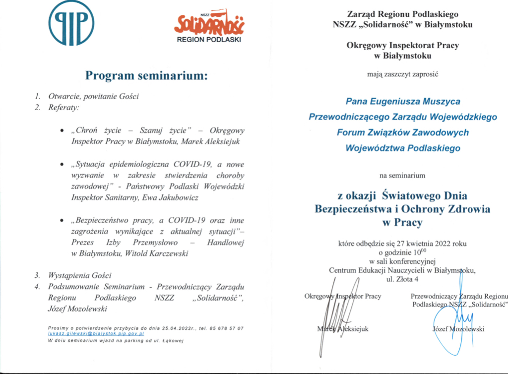 W dniu 27 kwietnia 2022 r. odbyło się seminarium z okazji Światowego Dnia Bezpieczeństwa i Ochrony Zdrowia w Pracy przypadającego na 28.04. Organizatorami seminarium promującego wiedzę o bhp, również w kontekście pandemii COVID-19, byli: Okręgowy Inspektorat Pracy w Białymstoku oraz Zarząd Regionu Podlaskiego NSZZ “Solidarność”.