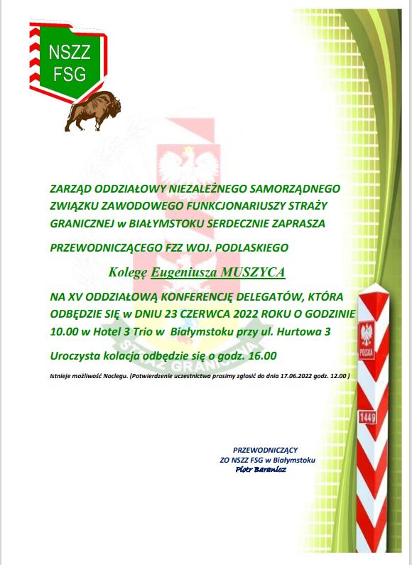 W dniu 23 czerwca 2022 r. w Hotelu 3 Trio w Białymstoku odbyła się XV Oddziałowa Konferencja Delegatów, na którą Zarząd Oddziałowy Niezależnego Samorządnego Związku Zawodowego Funkcjonariuszy Straży Granicznej zaprosił przewodniczącego Forum Związków Zawodowych woj. podlaskiego, Eugeniusz Muszyca.